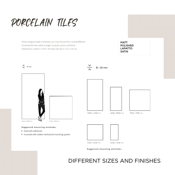 Glazed porcelain tilesare similar to ceramic tiles. They consist of a porcelain body with a layer of glaze applied to the surface. Almost anything can now be digitally printed on tiles' surfaces, thanks to recent technological advances. This means it’s possible to faithfully reproduce wood, marble, natural stones, etc.